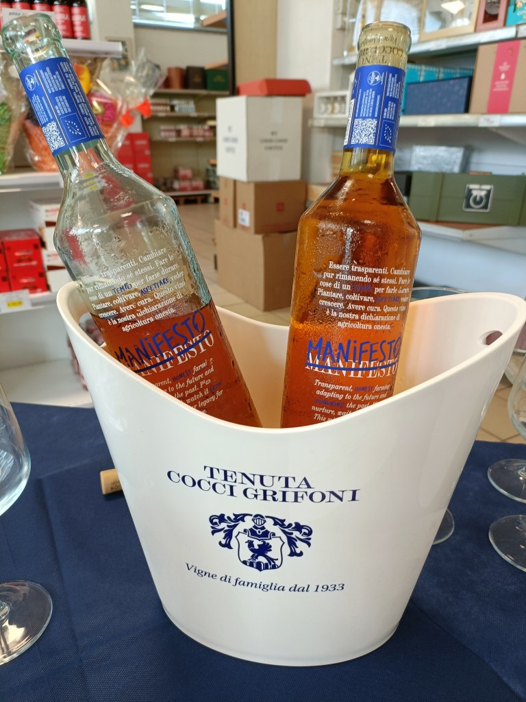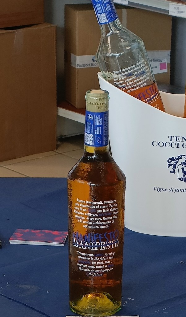 Per arrivare a Manifesto – aggiunge Camilla Capriotti Cocci Grifoni – è stato osservato come il vitigno si sia adattato al clima caldo delle nostre zone e alla tipologia di terreno per lo più sabbioso. Sono state condotte delle microvinificazioni, la prima nel 2022 di appena 20 litri poi nel 2023 si è osservato la sua resistenza all’attacco da peronospora con successive microvinificazioni. Finalmente il 12 agosto 2024 è stata effettuata la vendemmia rigorosamente a mano e in cassette.””Quindi – prosegue Camilla con entusiasmo -si è lavorato per capire il potenziale enologico e si è osservato come la buccia dell’acino risultasse sorprendentemente spessa, frutto quindi dell’adattamento del vitigno al luogo nel quale si trova. Da qui la decisione dell’equipe di puntare sulla tecnica della macerazione, per esaltare questa caratteristica dell’acino, un processo di vinificazione con un contatto prolungato delle bucce con il mosto. La fermentazione alcolica con utilizzo lieviti selezionati ha permesso di estrarre il colore, da qui la definizione di Orange Wine Moderno, il tannino e gli stessi aroma dell’uva. La vinificazione è in acciaio con le bucce a contatto con il mosto per un periodo di due settimane a temperatura controllata, segue una fase di affinamento in acciaio per 5 mesi.”